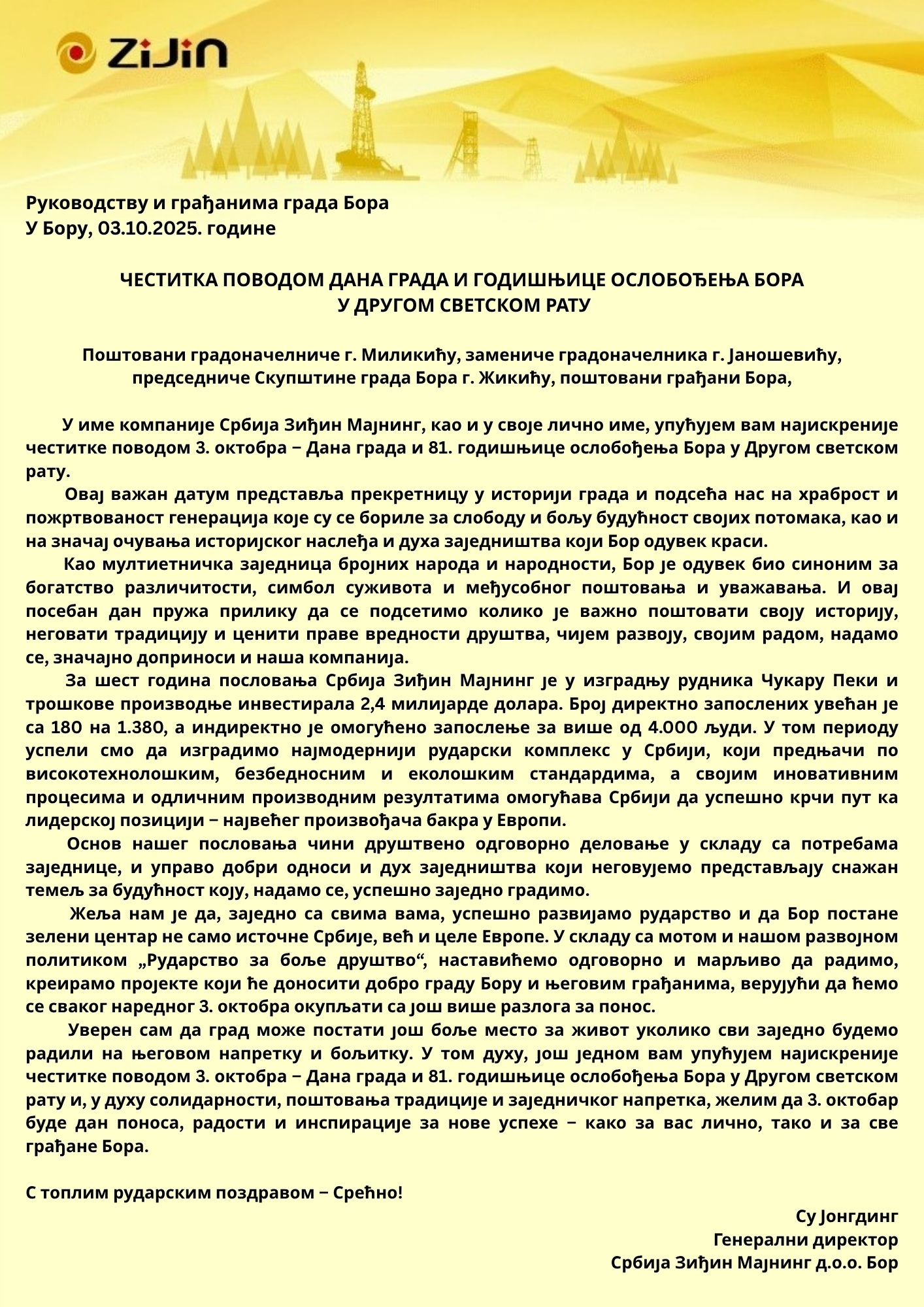 U ime kompanije Srbija Ziđin Majning, kao i u svoje lično ime, upućujem vam najiskrenije čestitke povodom 3. oktobra – Dana grada i 81. godišnjice oslobođenja Bora u Drugom svetskom ratu.