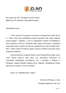 „U ime celokupnog rudarskog kolektiva kompanije Serbia Zijin Mining i u svoje lično ime izražavam iskreno saučešće zbog smrti dvojice kolega rudara. U vremenu u kom se svakodnevno borimo za bezbednost svakog radnika, za bolji i sigurniji život svakog zaposlenog u rudarskoj industriji, kao i za svakog rudara koji pošteno zarađuje svoj „hleb sa sedam kora“, vest o smrti kolega postaje još jedna strašna opomena na rizike časne rudarske profesije. U ime zaposlenih u rudniku bakra i zlata Čukaru Peki u Boru, koji u ovom teškom momentu dele vašu tugu, izražavam saosećanje sa članovima porodicama nastradalih, kao i kolegama u Lubnici i Resavici, kojima upućujem iskrene reči podrške. Povređenom kolegi želim brz, uspešan i potpun oporavak“, navodi se u telegramu saučešća vršiocu dužnosti direktora JP PEU „Resavica“ Saši Spasiću, direktoru rudnika lignita „Lubnica“ Ivanu Vasiljkoviću i gradonačelniku grada Zaječara Bošku Ničiću, koji je u ime kompanije Serbia Zijin Mining uputio generalni direktor Čen Jong.