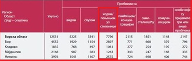 Slična je situacija i u gradu Boru i opštinama Borskog okruga: Negotin, Majdanpek, Kladovo, gde od ukupnog broja osoba sa invaliditetom najviše problema je upravo vezano za hod (vidi tabelarni prikaz).