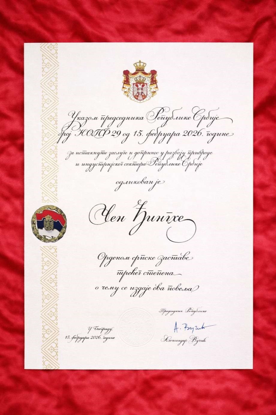 « PREDSEDNIK REPUBLIKE SRBIJE, ALEKSANDAR VUČIĆ ODLIKOVAO ČEN ĐINGHEA